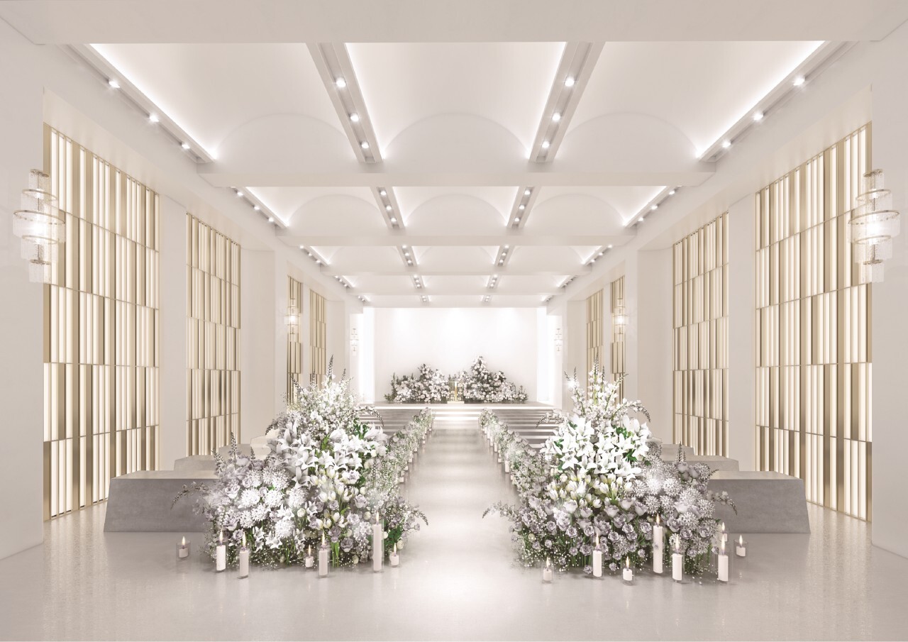 벽면을 투명・불투명 전환이 가능한 유리 벽면으로 조성해서 하객들이 홀 밖에서부터 걸어오는 신부의 모습을 볼 수 있다고 해요.