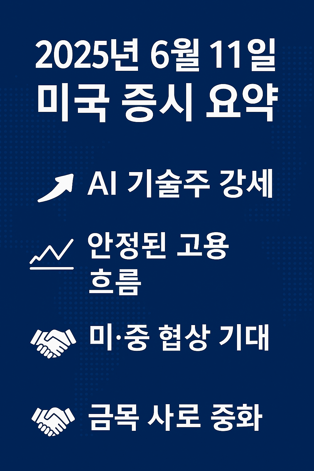 6월 11일 기준 미국 증시는 AI 중심 기술주 강세, 안정된 고용 흐름, 미·중 협상 기대, 금리·달러 흐름 변화 등 복합 요인이 맞물리며 대체로 상승 흐름을 유지하고 있습니다. 핵심 관전 포인트는 다음과 같습니다: