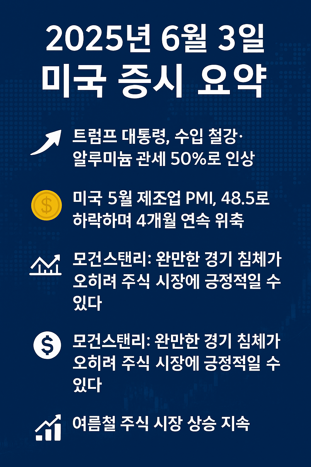 이번 2025년 6월 초의 미국 시장을 종합해보면, 대외적인 무역 이슈(트럼프의 관세), 미국 내부의 제조업 침체, 그리고 글로벌 안전자산 수요 확대 등 여러 요인이 동시에 작용하고 있습니다. 그럼에도 불구하고 기술주 중심의 회복세와 완만한 경기 침체 시나리오에 기반한 금리 인하 기대가 시장을 떠받치고 있습니다.